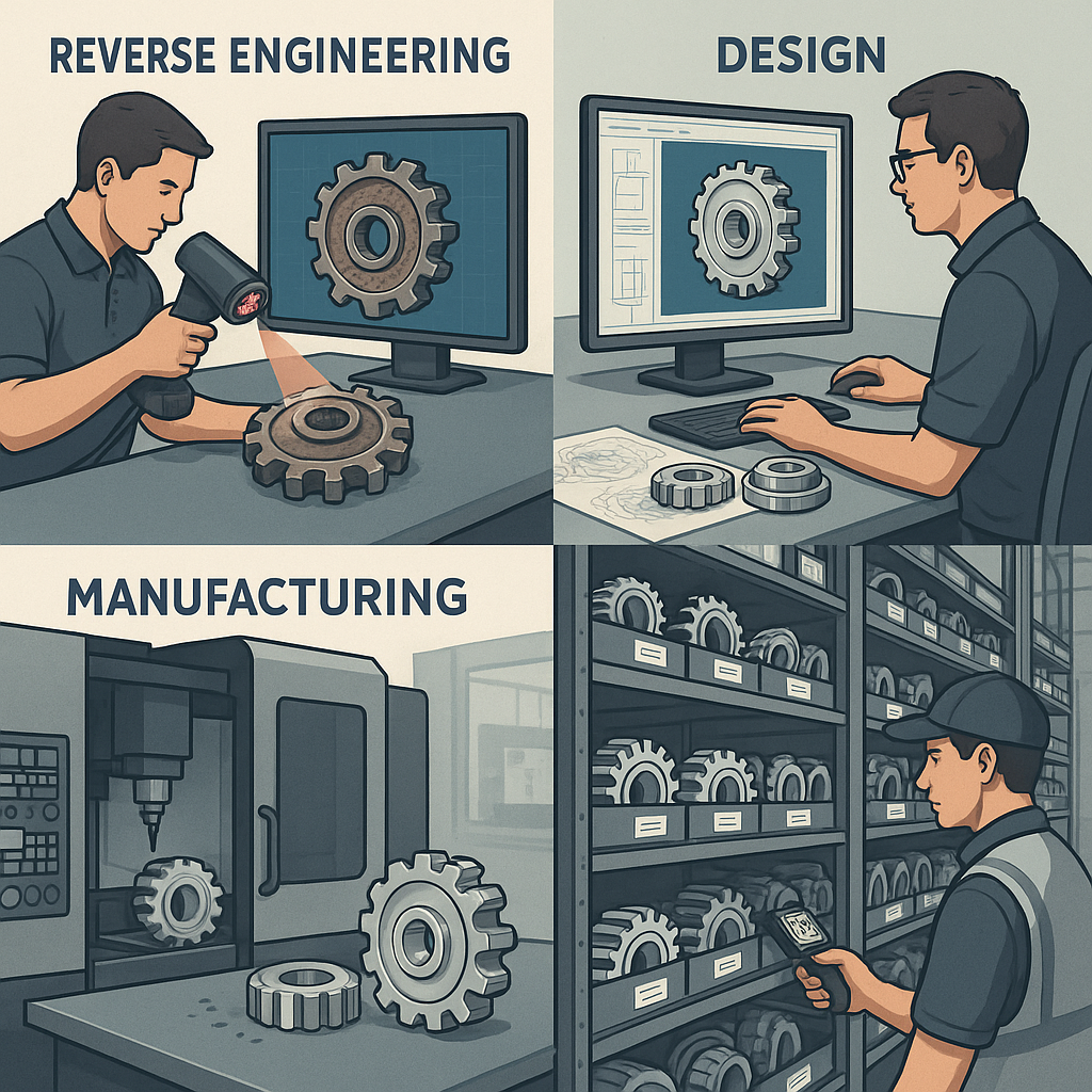 Rozpoczynamy od projektowania części, korzystając z nowoczesnych narzędzi, takich jak skaner 3D czy spektrometr, co pozwala nam precyzyjnie odwzorować lub zoptymalizować elementy mechaniczne.